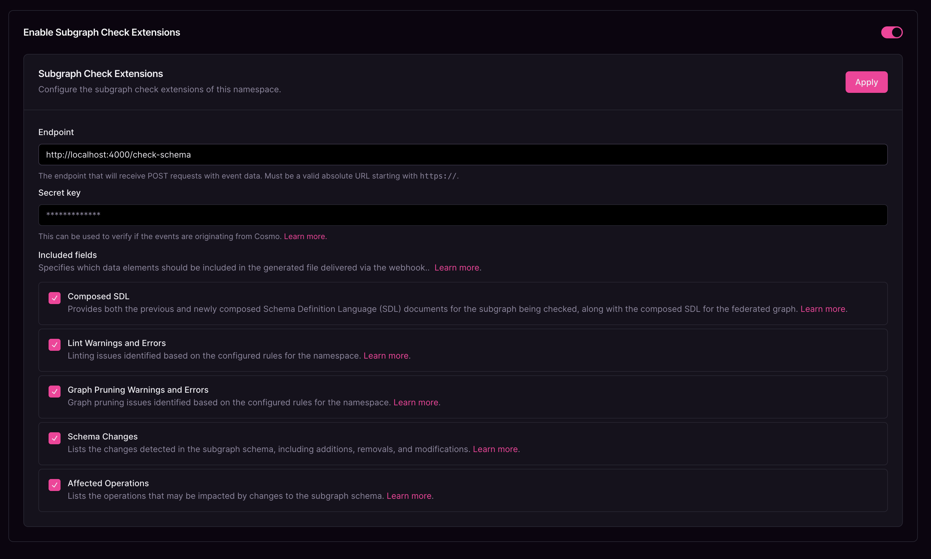 When the Subgraph Check extension is enabled for a namespace, each time a check runs against a graph in that namespace, a request is sent to the configured endpoint. This request includes details about the check and allows you to define additional lint issues or return error messages that can cause the check to fail.
